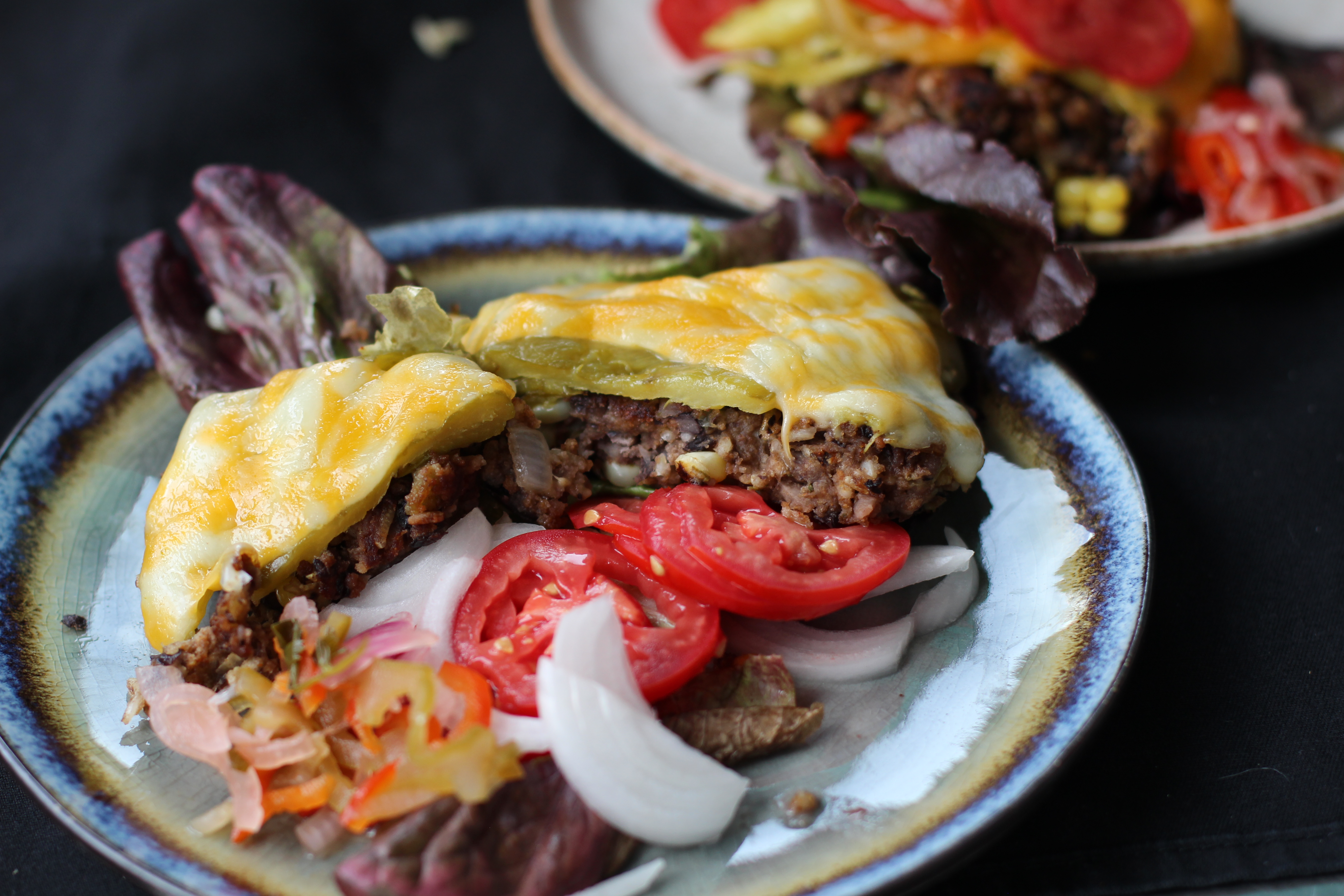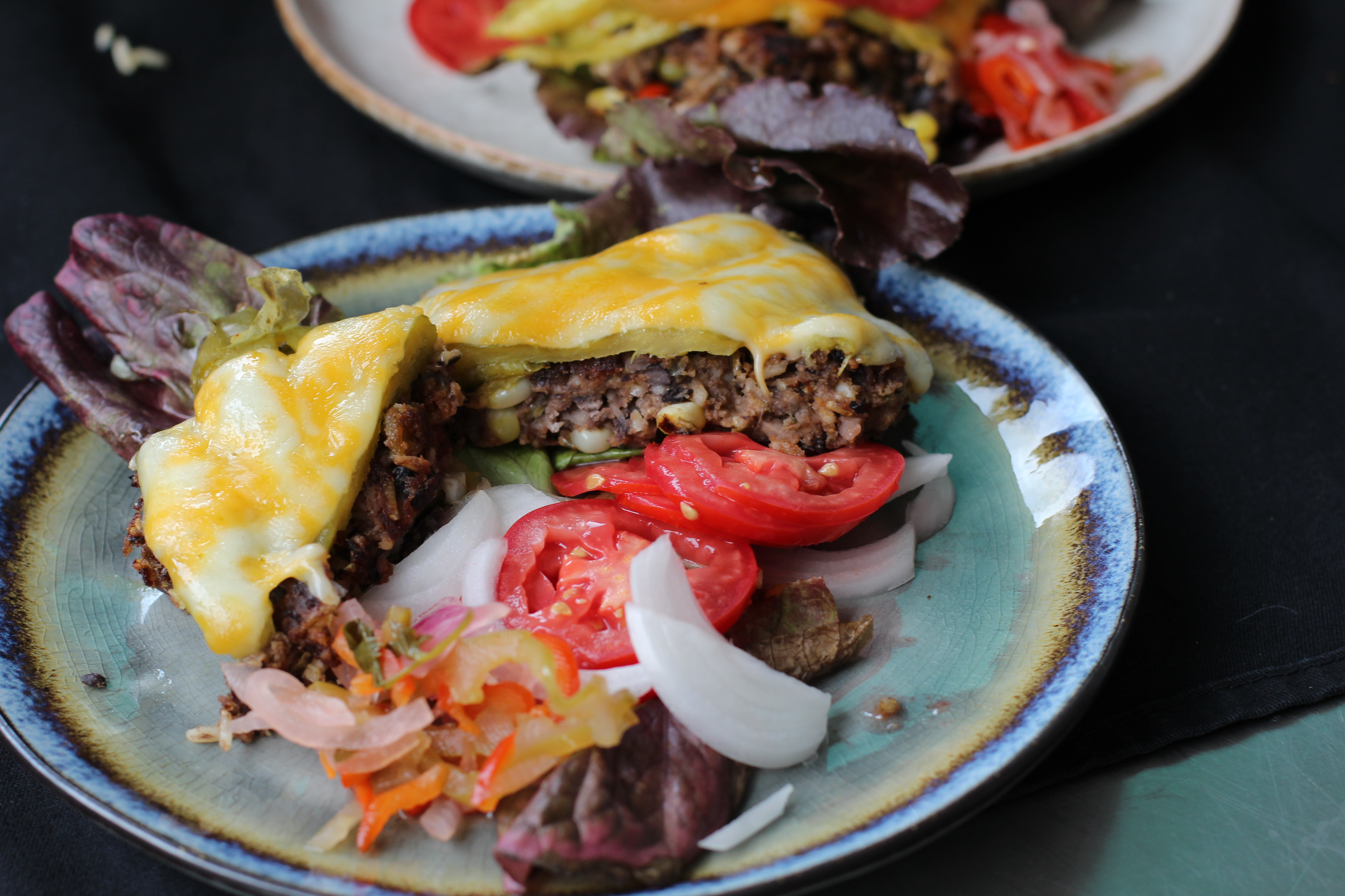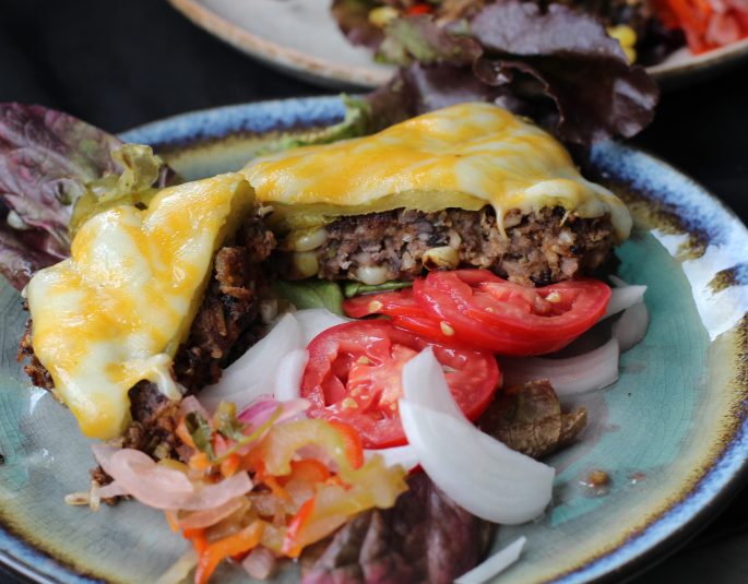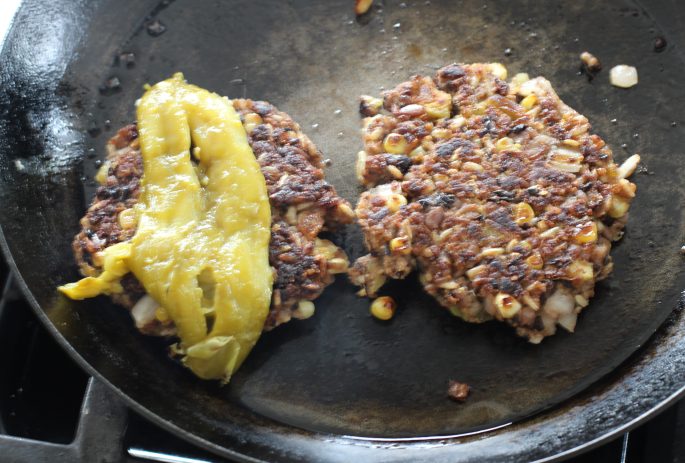 There are roasted chilies in the patty. I put more on top with some cheese. This is vegan if you leave off the cheese or use a vegan alternative cheese.