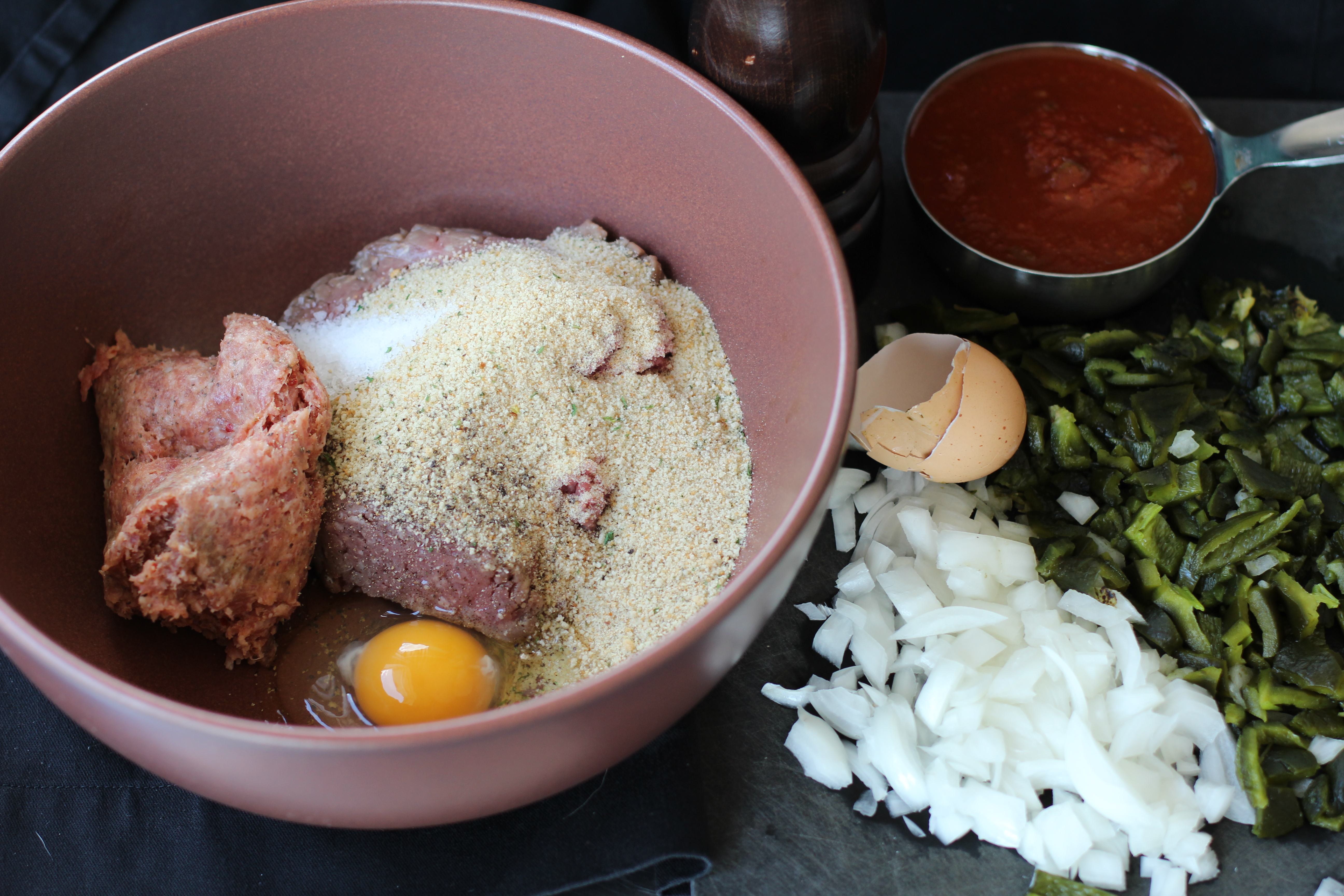 -1 ½ pound ground meat or meat substitute (I used ground turkey and turkey sausage)
