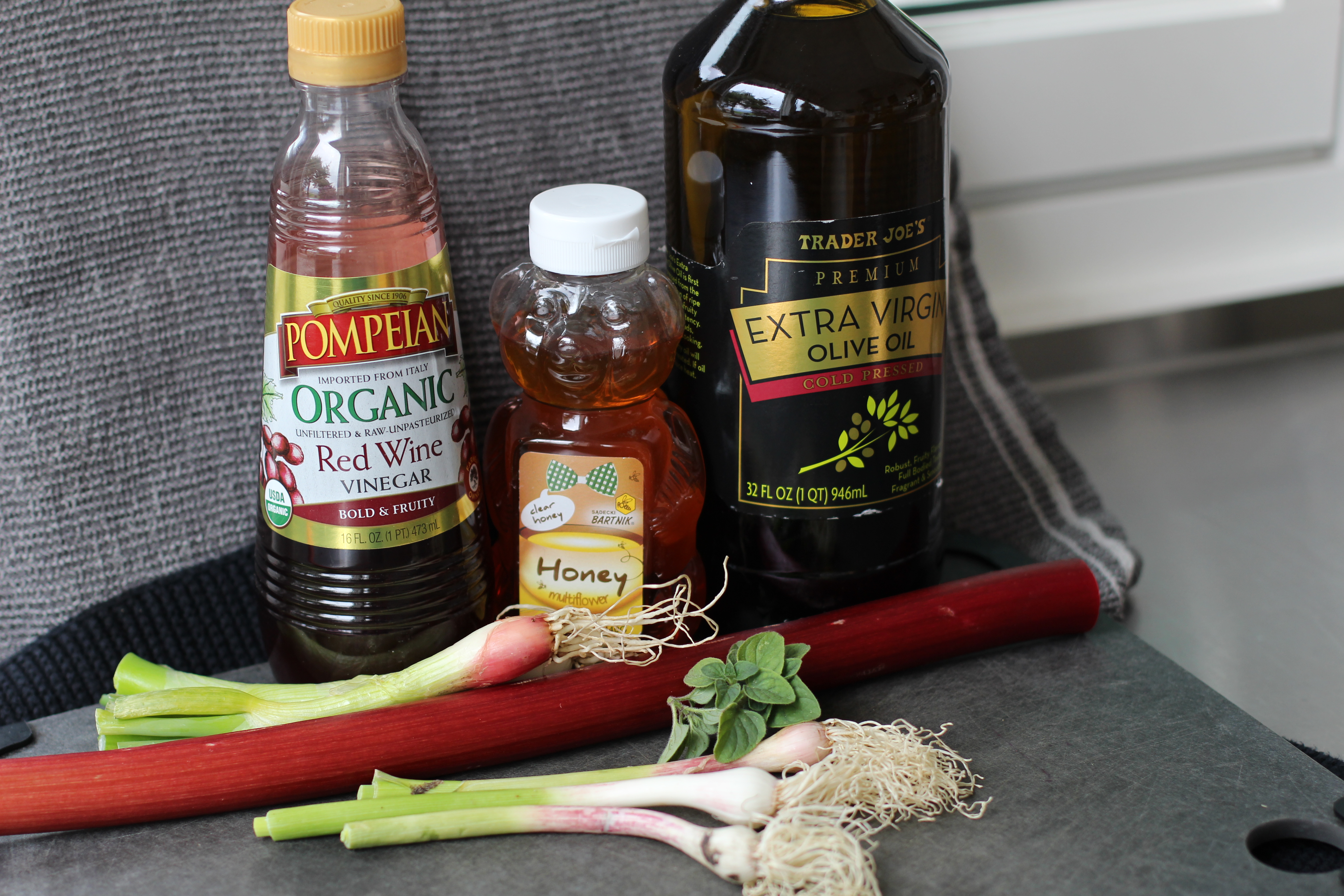 Chop the rhubarb and garlic and onions and put everything except 2 tablespoons of oil in the blender. Blend everything and thin the dressing with the oil you held back. This is a thick dressing!