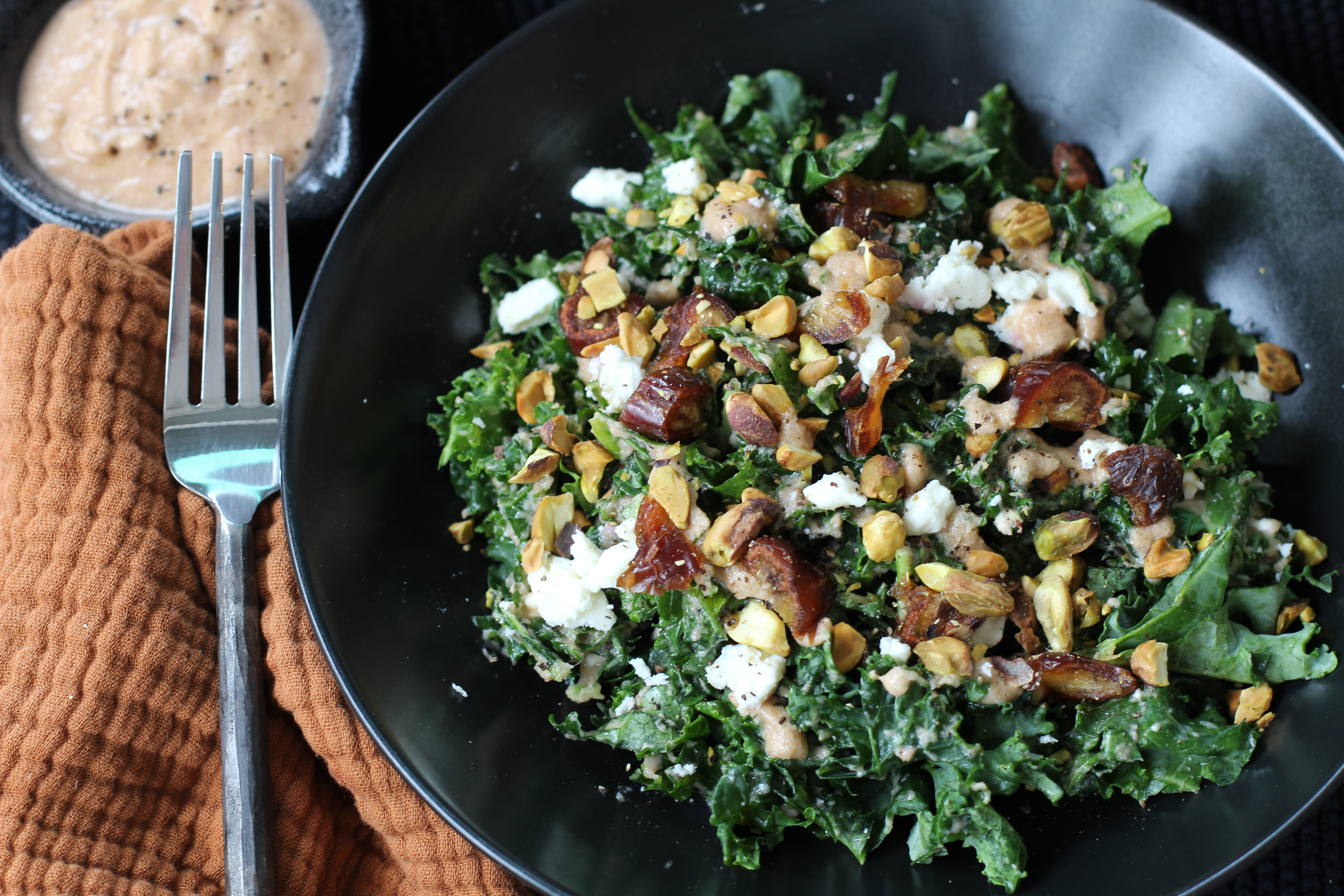 That’s it. Dress your salad. I used kale and I like to have cheese and fruit or protein in salad so I added feta, dates and pistachios, but use what you like. Apples and chicken would be delicious with this dressing. Use your imagination.