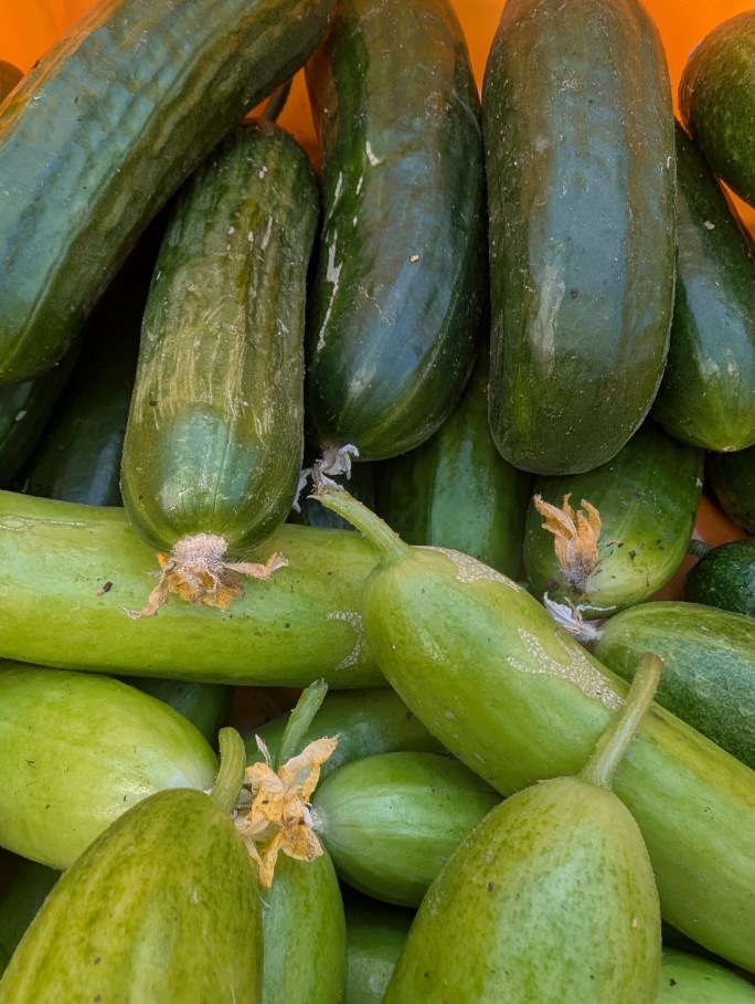 Carrots are new this week! We’ll have cherries and apricots again for the fruit share. Our cucumber plants are looking amazing this year- we planted and trellised them in the greenhouse to protect them more from pests and they’re thriving! They are so delicious and refreshing as a simple snack or thrown in a salad.