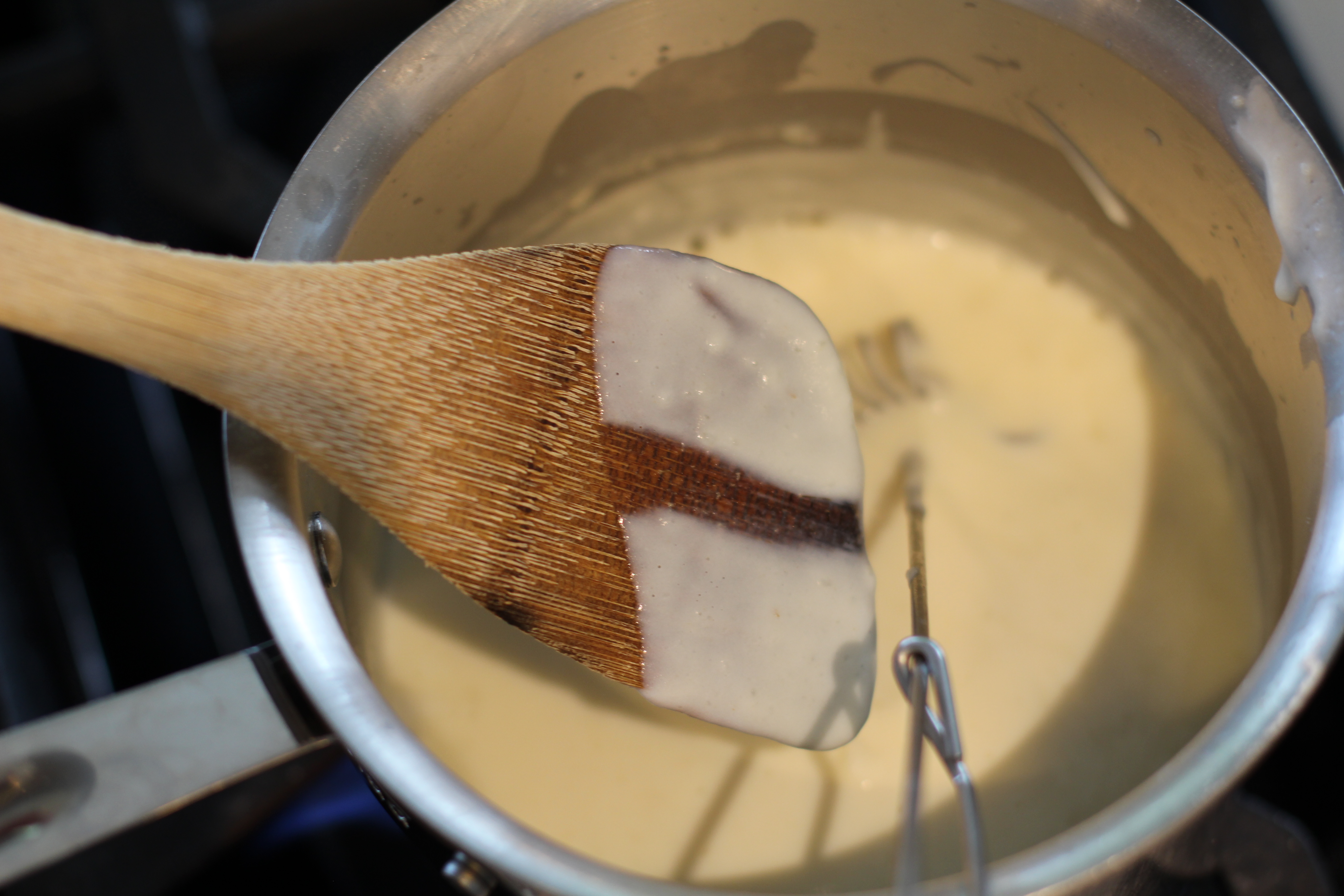 When the sauce has thickened (roughly the consistency of thin gravy), stir in the cheese, white pepper, and salt to taste. Remove sauce from heat.