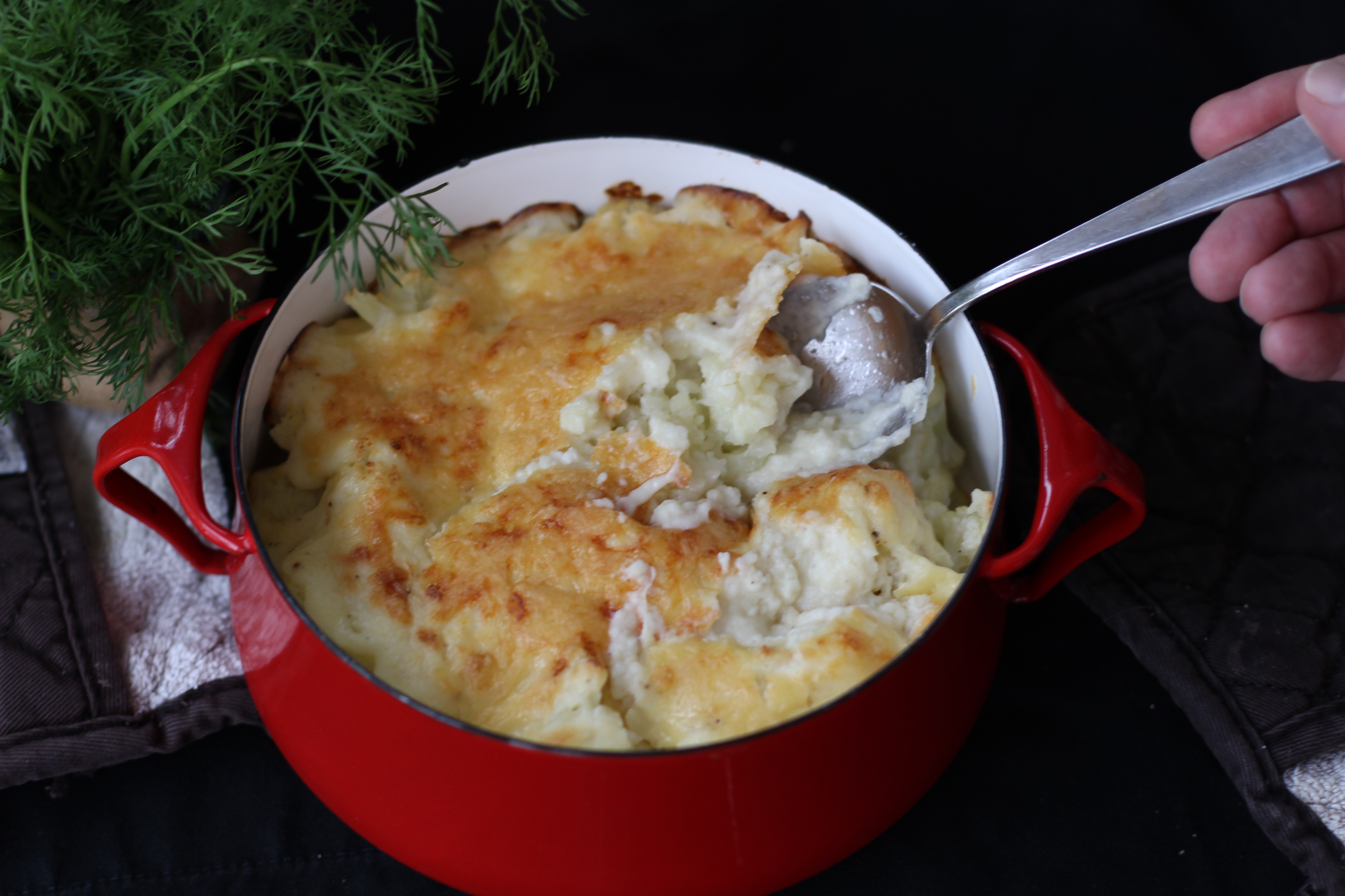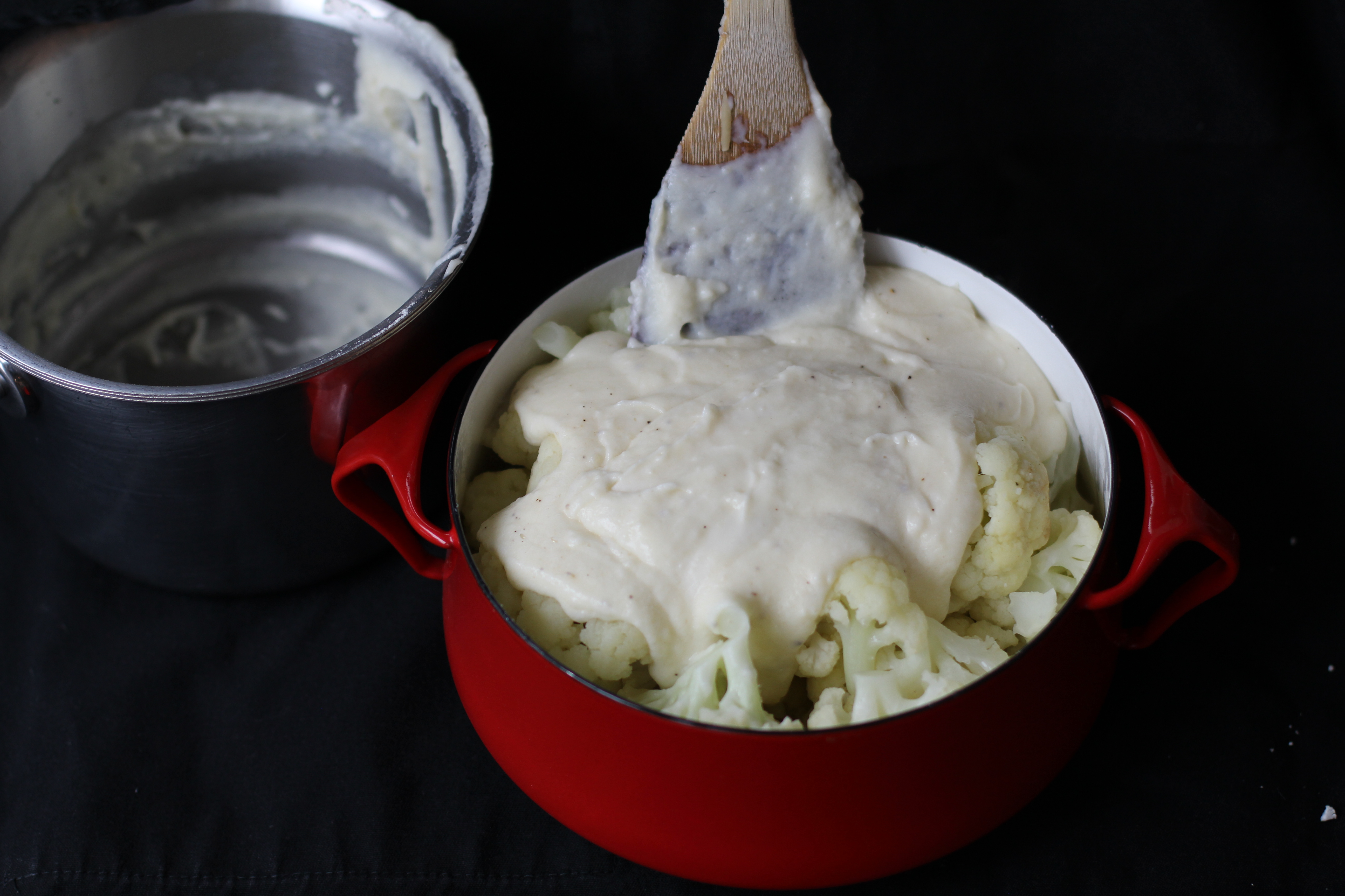 Place half of the florets on the bottom of your baking dish and half of of the Béchamel sauce.