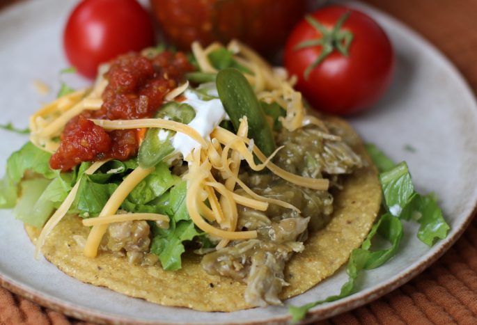 Chicken chile verde is a great base for lots of quick meals like burritos, nachos, tacos or tostadas.