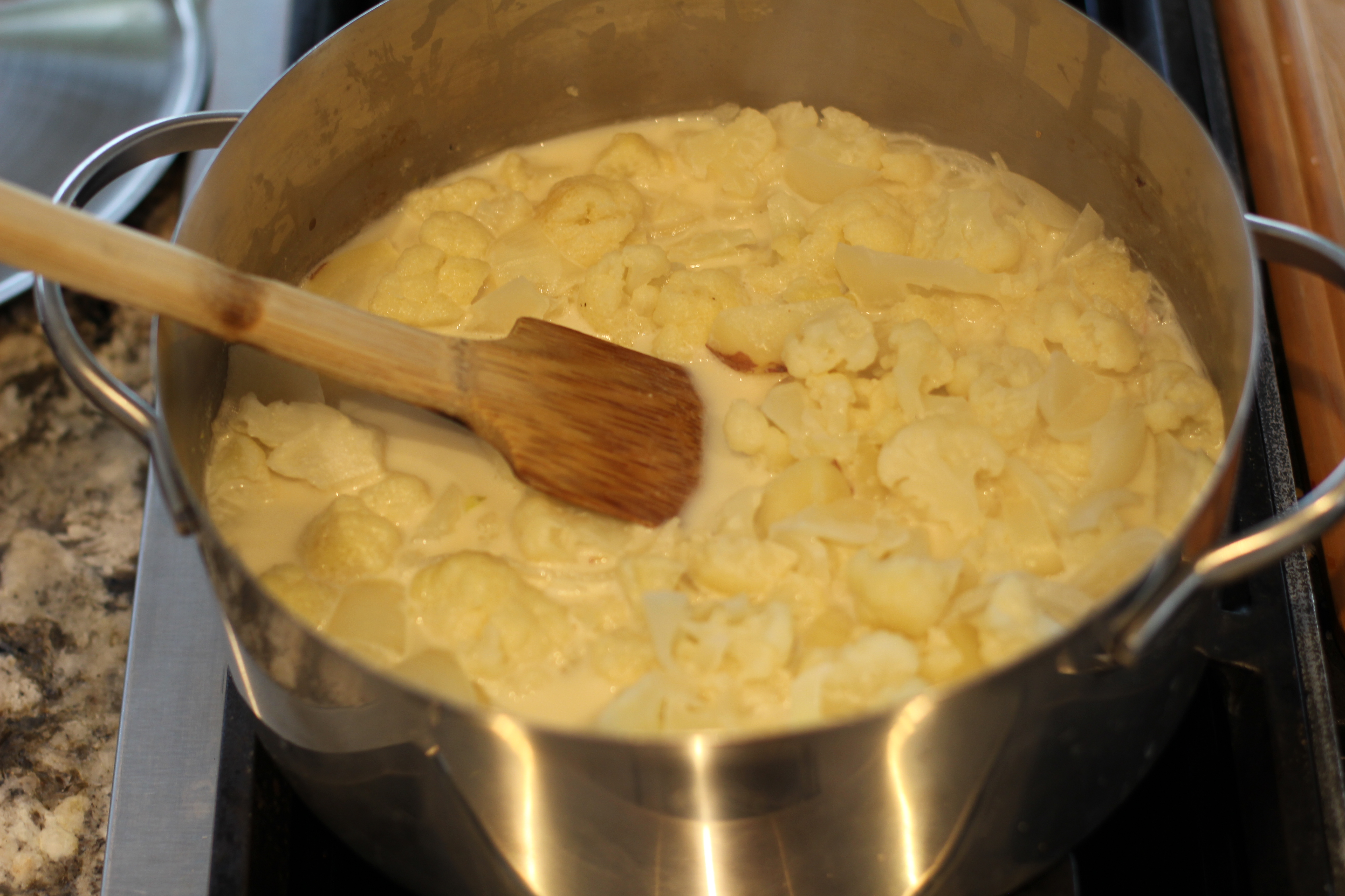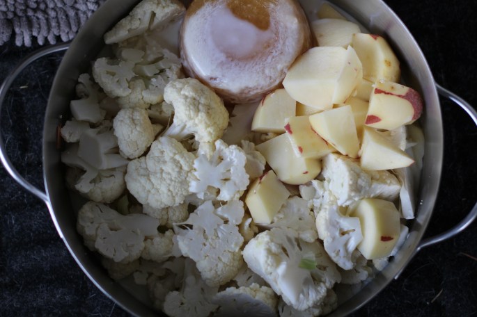 When the potatoes and cauliflower are soft enough to mash use and immersion blender or just a potato masher and blend the soup. This photo is before I blended it when the vegetables were all done.