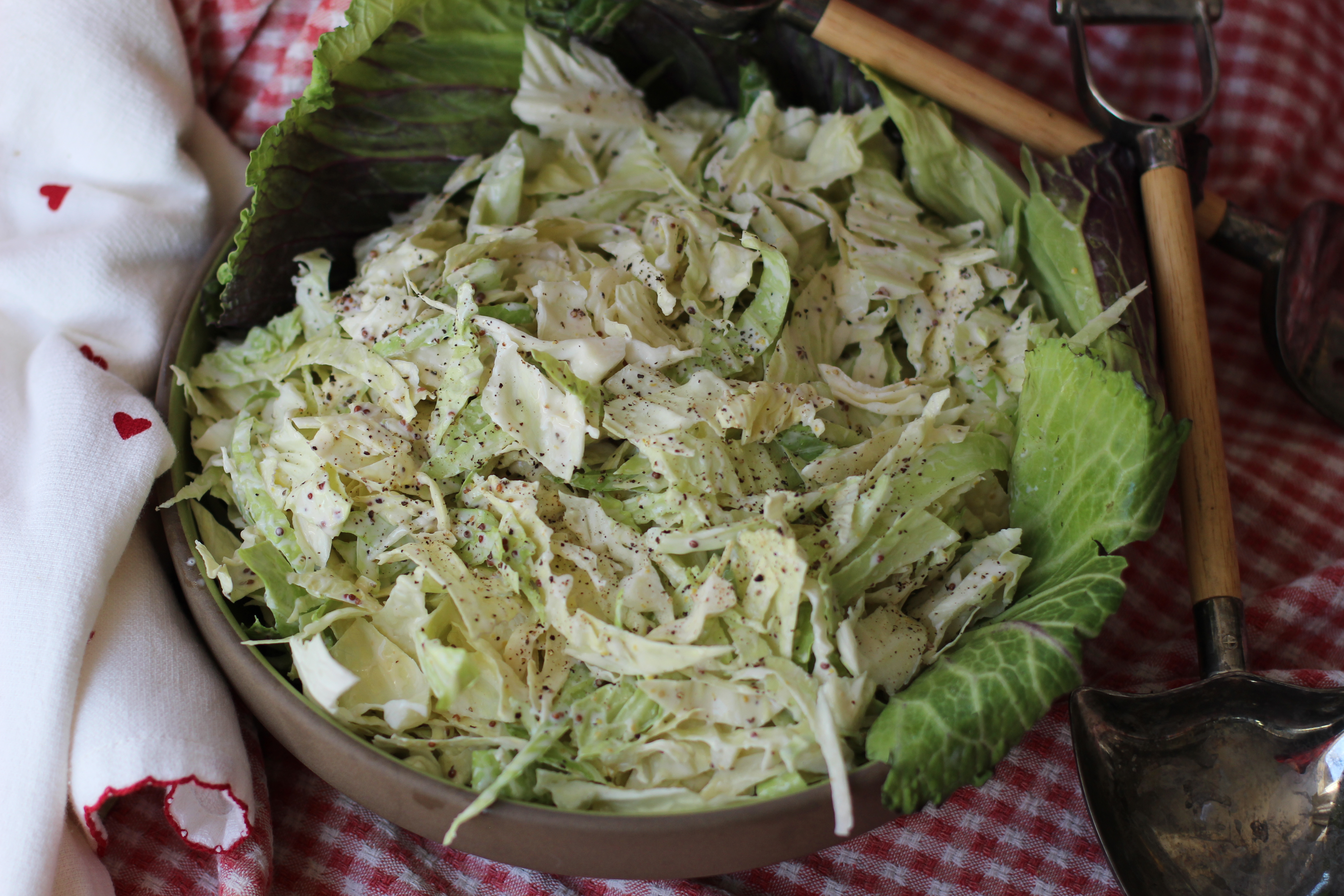 In a bowl mix together the mayo, vinegar, mustard, maple syrup, celery seed and a little salt and pepper. Taste it before you add it to the cabbage and make sure it tastes balanced. It should be tangy and just a little sweet and you should barely taste the mustard and celery seeds. If you want to taste more of anything add it now. It’s easier to get it right before you add it to the cabbage. Grab a piece of cabbage and dip it in the dressing to see if you are happy with the sweet-tangy-creamy-punchy dressing goal.