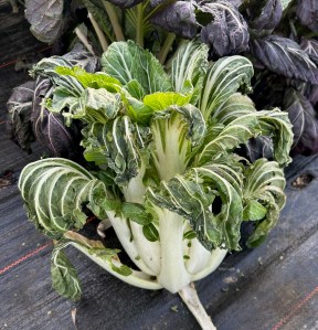 During January we normally harvest greens for our winter CSA from inside our greenhouse. It’s usually so cold by then that our greens that are growing outdoors or in our unheated tunnels are mostly dead. Unfortunately, the strong winds a few weeks ago beat up the tender greens like lettuce and bok choi that were inside the greenhouse. They might recover a bit. Or we might be short on greens in January. Fortunately, we have a lot of other veggies in storage so you won’t go hungry!