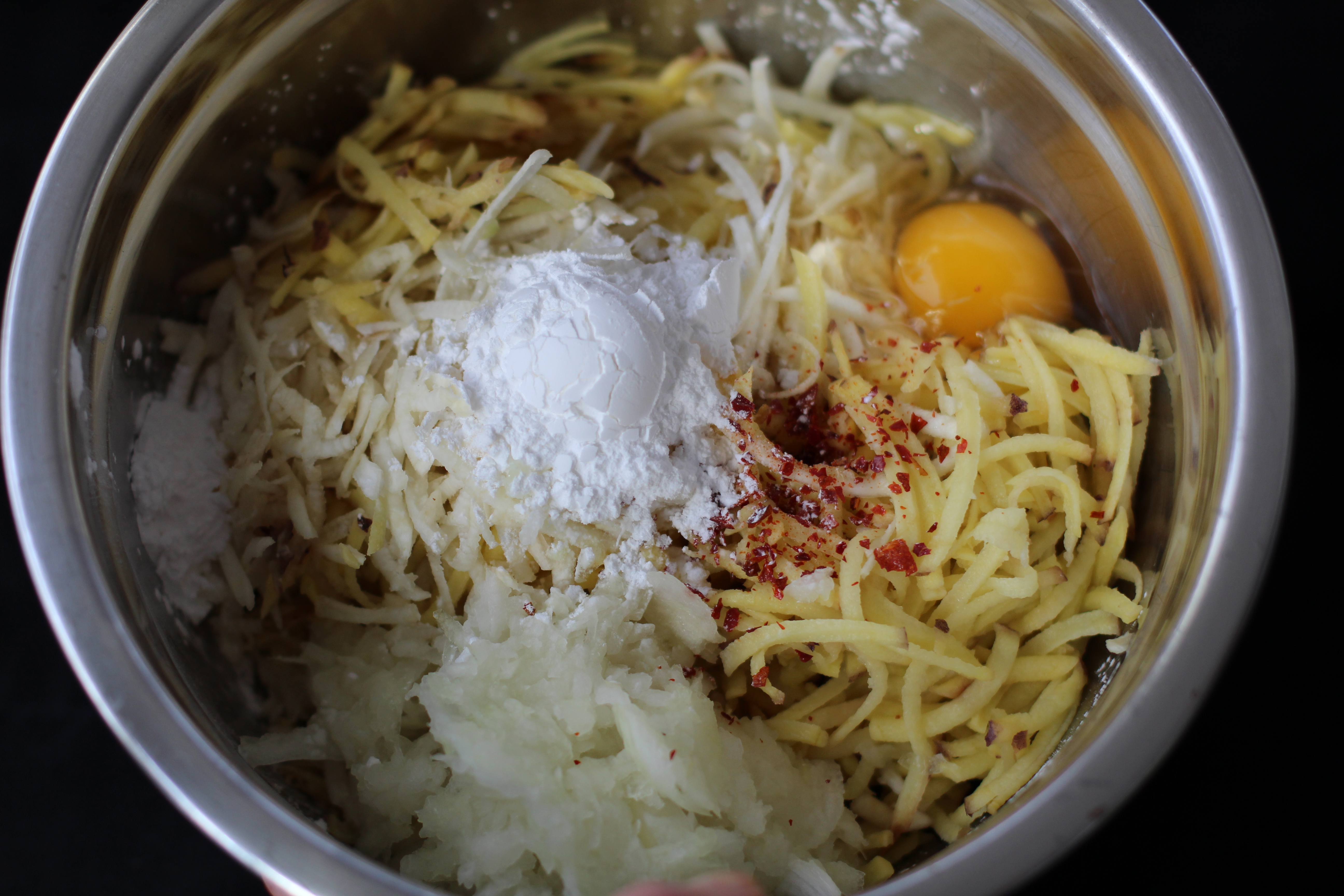 Throw everything in a bowl and toss/mix it really well. I know for latkes people squeeze out the water from the potatoes. I don’t ever squeeze. There is liquid at the bottom of the bowl, whatever, it always works out. If you want to squeeze your vegetables though, do it!