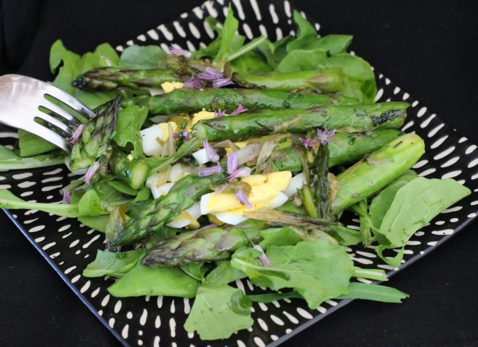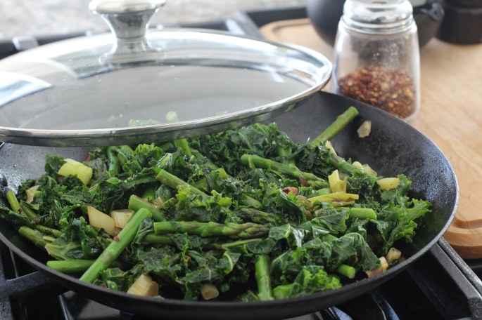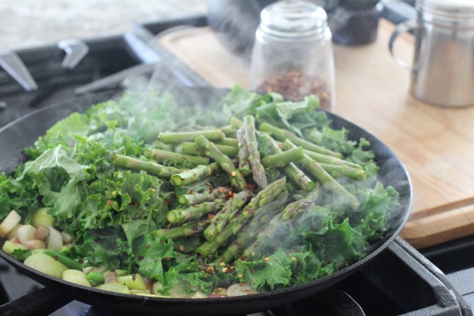 It was quick to make and very satisfying. I had some kale, walking onions and garlic scapes and a little asparagus. You could use collards or broccoli and any allium you like. I loved the creamy tang of goat cheese but any cheese or yogurt or vegan option would work.